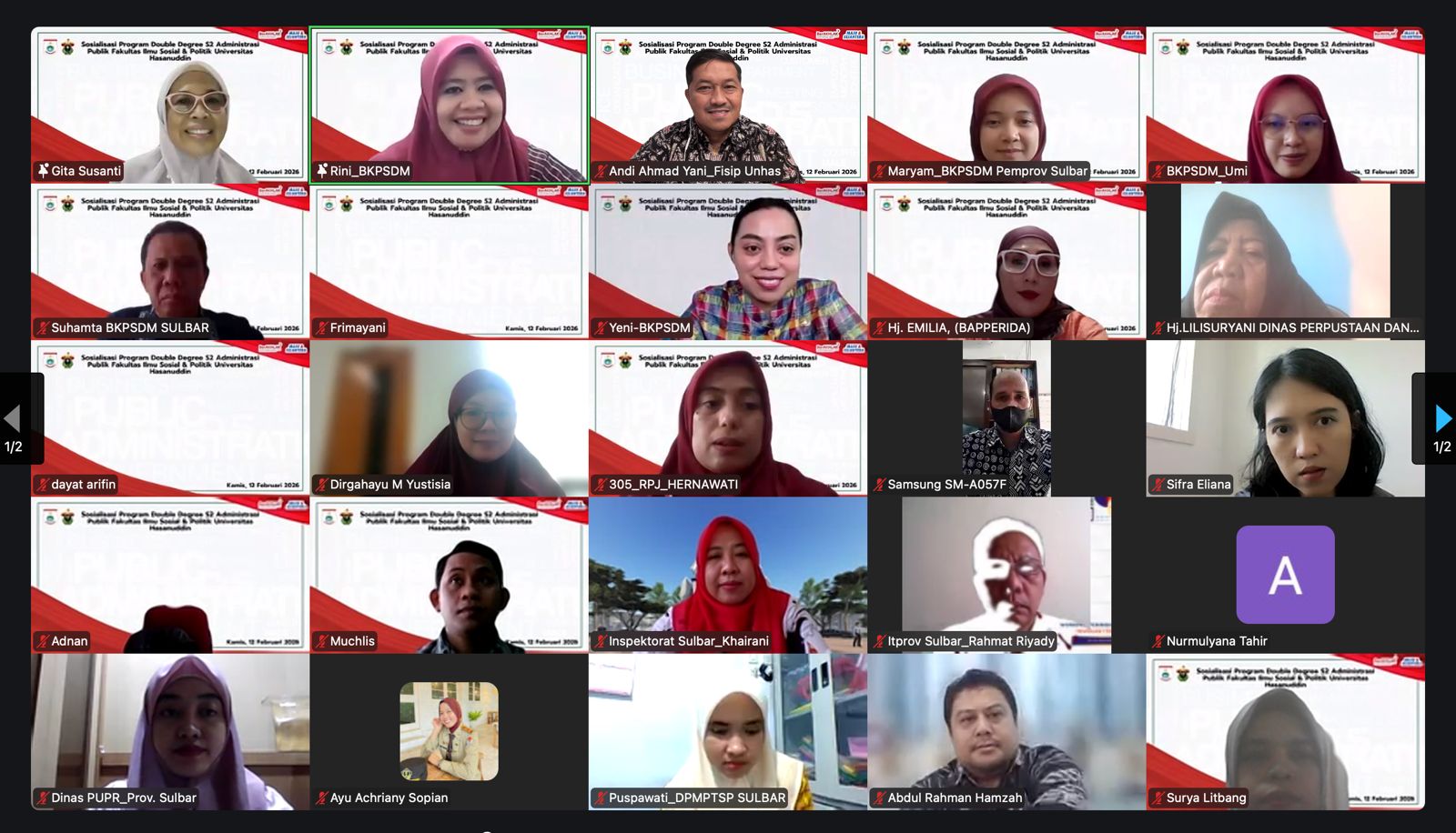 Makassar, 12 Februari 2026 — Program Studi Magister Administrasi Publik (MAP), Fakultas Ilmu Sosial dan Ilmu Politik (FISIP), Universitas Hasanuddin melaksanakan kegiatan sosialisasi program double degree bersama Badan Pengembangan Sumber Daya Manusia (BPSDM) Pemerintah Provinsi Sulawesi Barat pada Kamis, 12 Februari 2026 pukul 09.00–10.15 WITA secara daring. Kegiatan ini menjadi bagian dari upaya MAP Unhas dalam memperluas akses pendidikan internasional sekaligus mendukung pengembangan kapasitas aparatur sipil negara di daerah.
